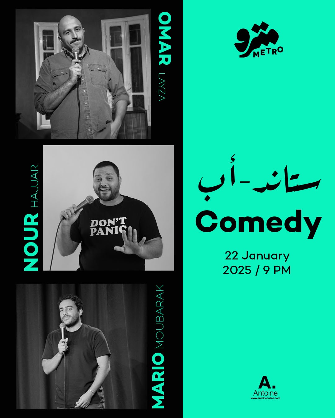 Stand-up Comedy night with Nour Hajjar Omar Layza Mario Moubarak Wednesday 22 January 2025 Doors open at 8:15 PM Event starts at 9 PM Tickets on sale at Metro Al Madina (Ticketing booth & website), Librairie Antoine branches or through Antoine online ticketing. (Chairs only seating) Zone A: […]